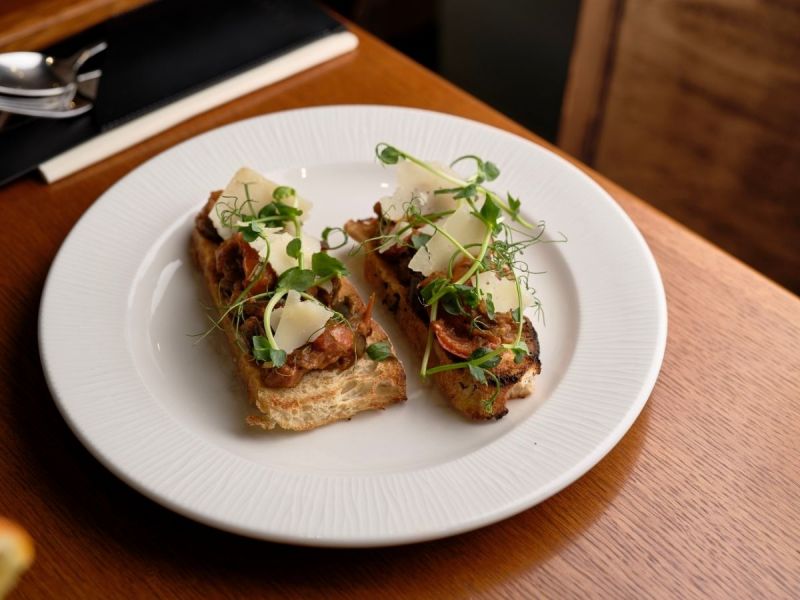 Bruschetta Caponata Opečený chléb s lilkem, cherry rajčátky, olivami, sušenými rajčaty a parmazánem