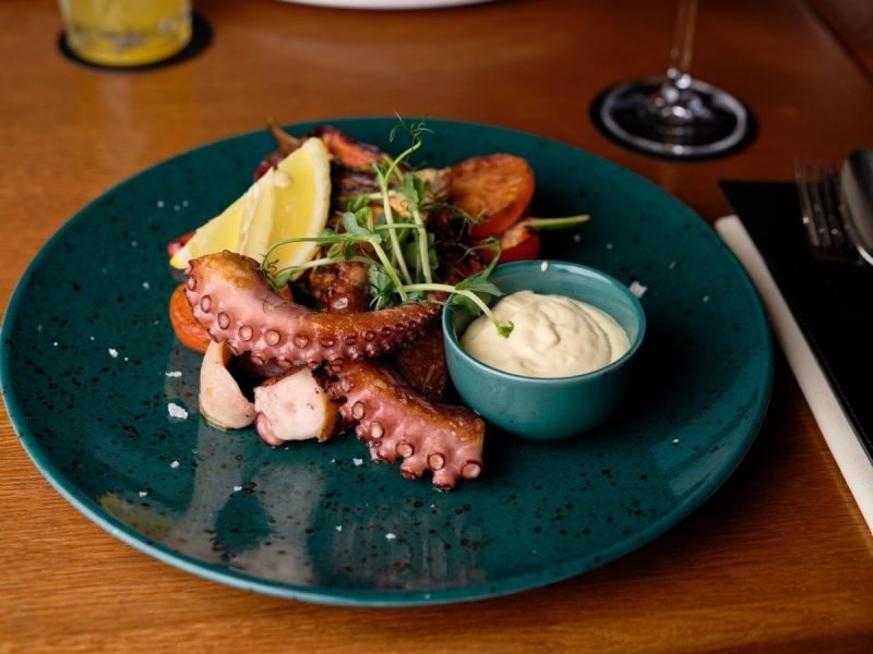 Polpo alla Griglia con Verdure Arrosto e Salsa Aïoli Grilovaná chobotnice s pečenou zeleninou a aïoli omáčkou