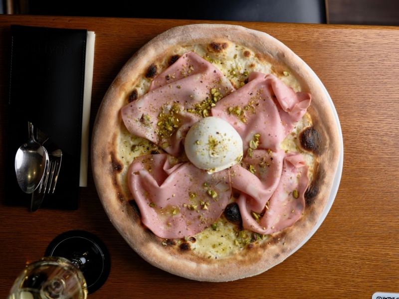 Pizza Mortadella e Pistacchi Pizza se smetanou, mozzarellou fior di latte, mortadellou, pistáciemi, mozzarellou di bufala a citronovým olejem