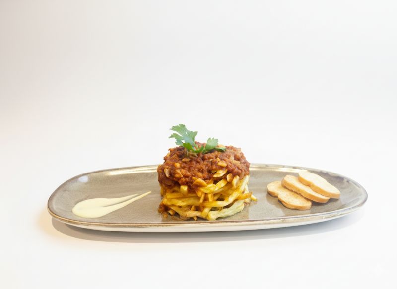 Revuelto con bacalao - směs z tresky, cibule, vajec, olivového oleje a koření. Jemná textura, výrazná chuť moře a křupavé bramborové nitky.