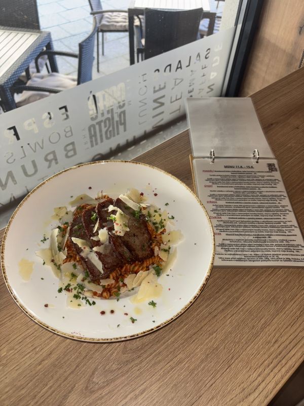 Vepřová panenka plněná sušenými rajčaty a rukolou, penne s čedarovou omáčkou zakápnuté italským pestem
