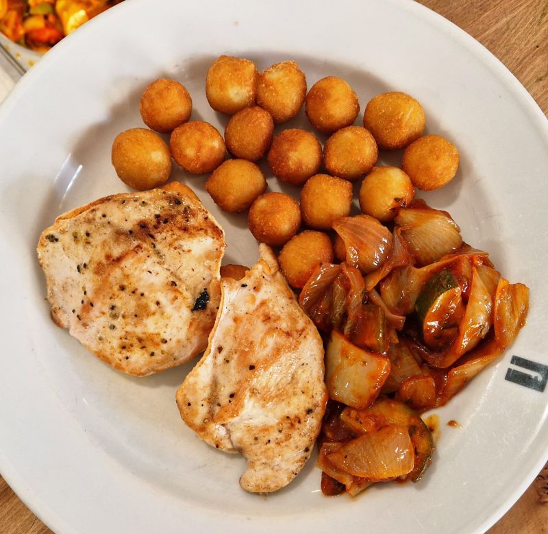 Grilované kuřecí medailonky, grilovaná zelenina, bramborové krokety