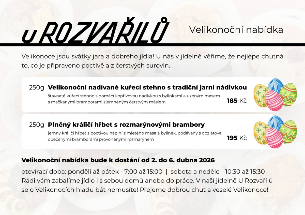 Rádi vám zabalíme jídlo s sebou domů anebo do práce. V naší jídelně U Rozvařilů se o Velikonocích hladu bát nemusíte! Přejeme dobrou chuť a veselé Velikonoce!