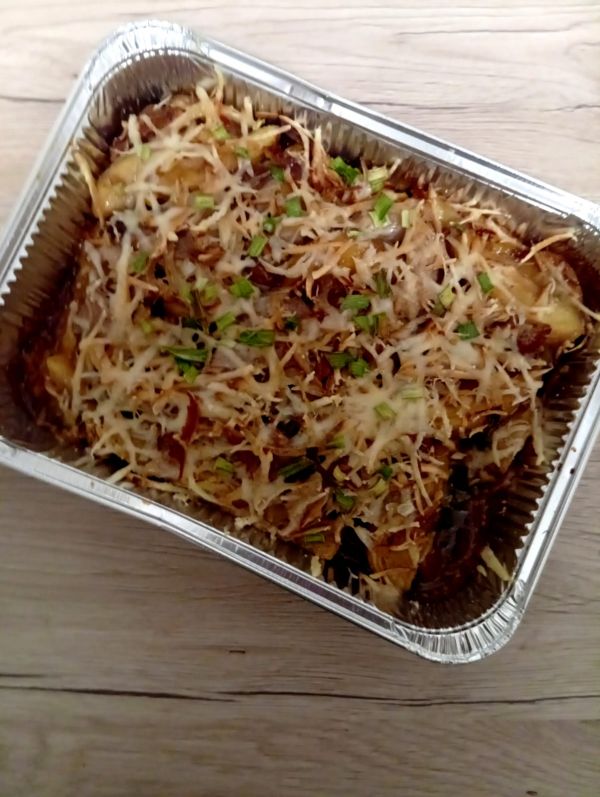 650 g Miska s pečeným bůčkem (vepřový bůček, pečené brambory, cibule, česnek, silná masová šťáva, uzený sýr) 7