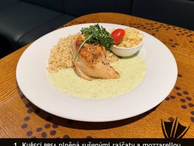 Kuřecí steaky s chorizo a cheddarem, rajčata, olivy, bylinkový kus-kus
