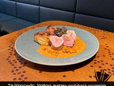 Filírovaná vepřová panenka špikovaná slaninou, jemná parmazánová omáčka, krokety