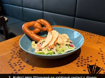 Tapas plato – Tapas kuřecí prso, míchaný salát, marin. cibule, chimichurri, pita chleba (249)