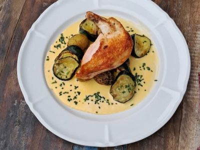 Steak z telecí kotlety, grilovaná cuketa, salsa aioli (325)