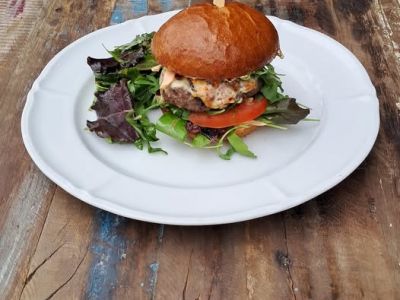 HOVĚZÍ CHEESBURGER SE SLANINOU A SÝREM GOUDA, karamelizovanou cibulí, rukolou a pikantní majonézou, mesclun salát