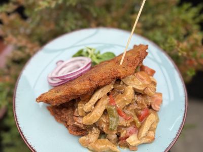 Smažená kuřecí kapsa (hermelín, poličan), opékané brambory, bylinkový dresing (A1a, 3, 7, 10) 13710