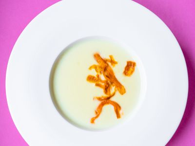 Polévka 1: Krém z pečeného česneku, bazalkové pesto, krutony