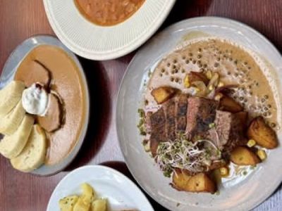 Hovězí svíčková na smetaně s variací knedlíků, brusinkový terč