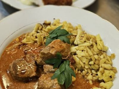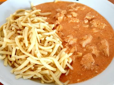 Trhaná slepice pečená na paprice a smetaně s domácím houskovým knedlíkem, nebo těstovinami 137