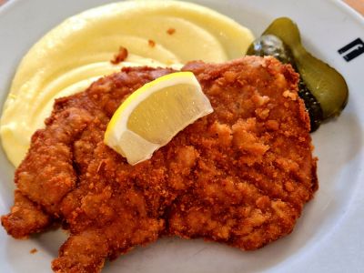Holandský řízek s jemnou bramborovou kaší, kyselá okurka