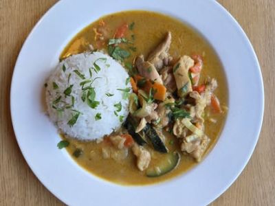 Thajské červené kari s kuřecím masem (kokosové mléko, paprika, bambus, ananas, bazalka), dušená jasmínová rýže 7