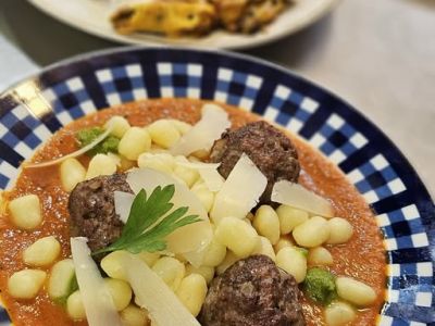 Brodo di gallina - Silný slepičí vývar se zeleninou, masem a semolinovými nudlemi, podávaný s naším chlebem z pece, Le polpette di manzo Naše kuličky z hovězího masa, čerstvého oregána a parmazánu v jemné rajčatové omáčce s lístky