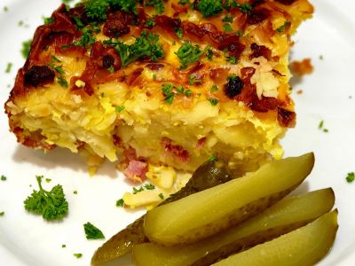 Zapečené těstoviny s uzeným masem, kyselá okurka 137