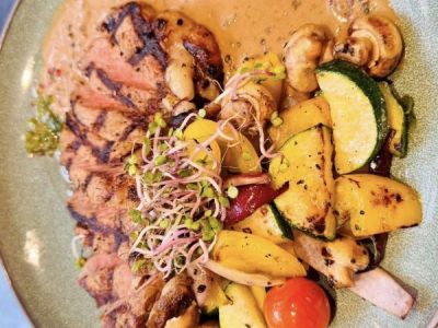 150 g Hovězí sous-vide Top-side steak na lávovém grilu, podávaný s grilovanou zeleninou a steakovým máslem