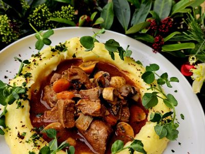150g Vepřová kotletka, pepřová omáčka, šťouchané brambory
