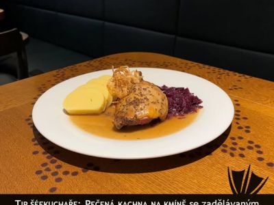 Kuře ala bažant- pečené kuřecí stehno s divokým kořením, suchým bílým vínem, komínovou slaninou, vavřínem, čersrvým tymiánem a rozmarýnem, podávané se silnou přírodní štávou jasmínovou rýží nebo bramborovými knedlíky/1,3/