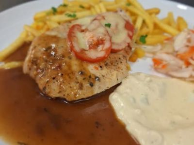 Menu 10: 189 150g Marinovaný kuřecí steak na grilu zapečený se šunkou a sýrem gouda, krokety