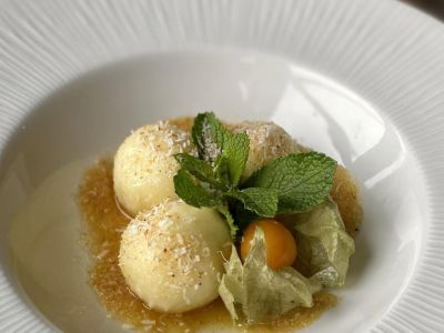 Borůvkový knedlík sypaný tvarohem, máslem a cukrem