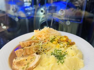 Menu 4: 179 150g Smažený holandský řízek s čedarem, šťouchaný brambor na cibulce, okurkový salát