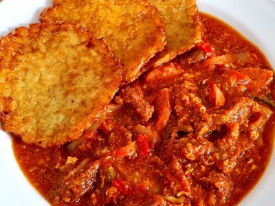 150g Hovězí ragú na víně se žampiony, bramboráčky