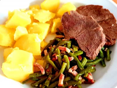 Boeuf Bourguignon-pomalu tažené kostky z hovězí kýty v silné omáčce s červeným vínem, komínovou slaninou, kořenovou zeleninou, čerstvým rozmarýnem a divokým kořením, podávané s bramborovou kaší a pečeným rajčetem /1,7/