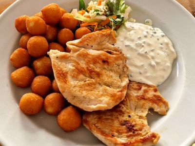 Řízečky z vepřové panenky, petrželkové brambory, citrón (obsahuje 1,3,6,7,9,11)