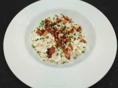 * Bramborové gnocchi s kuřecím masem, špenátem na česneku, smetanou a parmazánem
