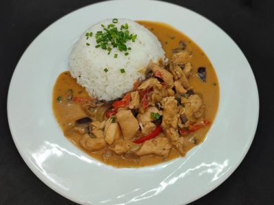 TÝDENNÍ OBĚDOVÁ SPECIÁLKA: Kuřecí nudličky s nivou, houbami, pórkem a smetanou, Basmati rýže / hranolky