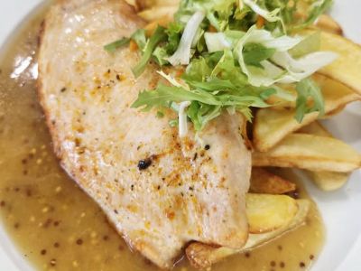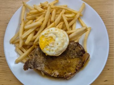 Vepřový steak se sázeným vejcem a hranolky 150g