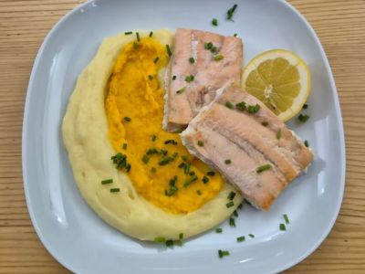 Kuřecí řízek na přepuštěném másle s mléčnou bramborovou kaší, kyselou okurkou a citronem