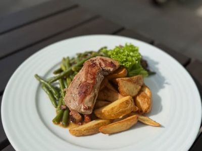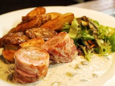 SPECIALITA- Jelení medailonky na hříbkách, opečené brambory s cibulkou a slaninou