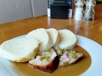 Uzenářské vepřové výpečky, zelí a špekové knedlíky