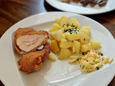 Smažený kuřecí řízek s bramborovou kaší, okurkový salát. 150