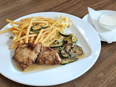 Vepřový steak s hermelínem a brusinkami, hranolky, obloha.