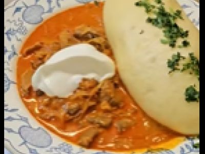 Tradiční kuře na paprice-kuřecí prsa v silné omáčce s cibulí, divokým kořením, máslem, maďarskou paprikou a smetanou, podávané s domácími karlovarskými knedlíky nebo těstovinami /1,3,7/