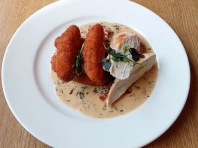 Kuřecí stehenní plátek se šunkou a sázeným vejcem, silná masová šťáva, šťouchané brambory 137