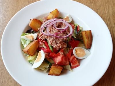 300 g Velký zeleninový salát s kuřecím prsíčkem, sázeným vajíčkem, a česnekovým dresinkem