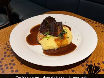 SPECIALITA DNE Dušená hovězí veverka z irského chovu, znojemská omáčka, variace knedlíků 189, -Kč 13712