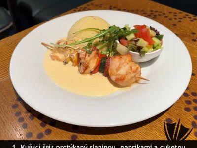 Kančí guláš-pomalu tažená kýta z divočáka v silné omáčce s komínovou slaninou, cibulí, červeným vínem, divokým kořením, rozmarýnem a maďarskou paprikou, podávané s cibulí, houskovým knedlíkem nebo domácími bramboráčky /1, 3, 7/ 15