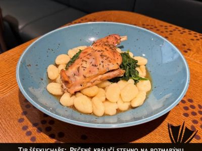 180g Pečený králík na slanině s růžičkovou kapustou a bramborovým knedlíkem