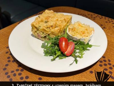 Zapečené francouzské brambory s uzeným masem, kyselá okurka