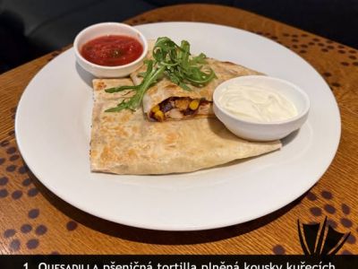 Hovězí quesadilla z argentinské kýty, olivy, sýrem cheddar, salsou pico de gallo picante, zakysanou smetanou