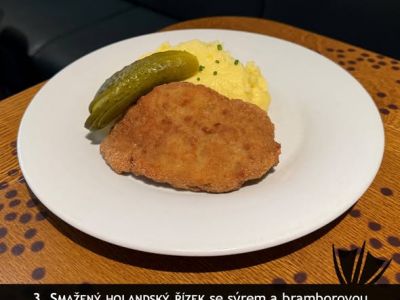 3: Smažené žampióny plněné nivou, vařený brambor cena: 150 / 160 s polévkou
