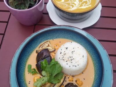 Thajské žluté kari s tofu – voňavé kari z kokosového mléka se smaženým tofu, karotkou, cuketou a mungo klíčky, dochucené čerstvým koriandrem a limetou, podávané s basmati rýží