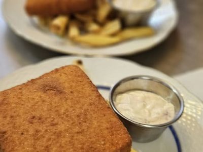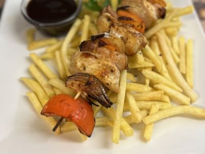 Kuřecí steak s broskví a sýrem, hranolky, tatarka