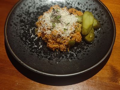 Pečená vinná klobása s vařenými brambory a kyselou okurkou, tatarka